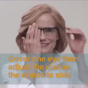 Before placing glasses, note that there are dials on the side of each lens. This is important to note, as adjustments will be made through this dial / small button.